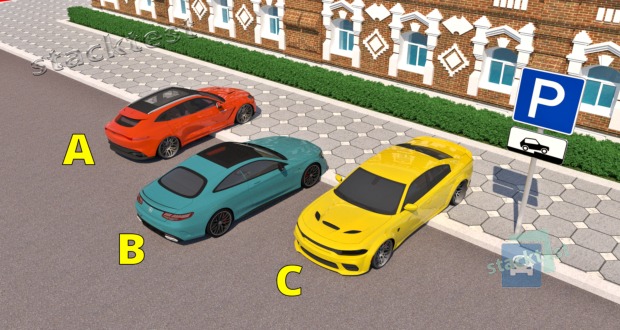 Какой автомобиль поставлен на стоянку правильно?Комментарийзнак 863a «Способ постановки транспортного средства на стоянку» указывает способ постановки на стоянку транспортных средств категории «А» длиной менее 6 метров, категории «В» без прицепа и подкатегории «D1» без прицепа на прилегающей к тротуару парковочной площадке, обозначенной знаком 575«a» или 575«b» «Парковочная площадка» либо знаком 575«c» «Парковочная площадка при объекте сервиса». На табличке указано, что необходимо парковаться с заездом передними колёсами на тротуар.Только автомобиль А выполнил данное требование.