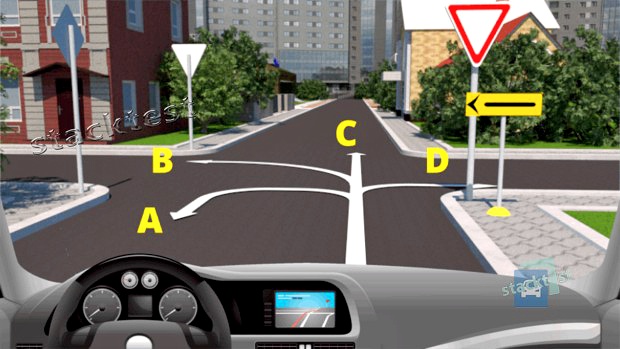 В каком направлении, из указанных стрелок, может двигаться водитель в населённом пункте?A; B; C; Dзнаки «Направления движения по полосам» указывают количество полос для движения нерельсовых транспортных средств по одной стороне движения или по всей ширине дороги на участке до ближайшего перекрестка или до места пересечения с дорогой подъездных путей от прилегающих к дороге территорий и обязательное направление движения с каждой полосы на перекрестке или в месте пересечения с дорогой подъездных путей от прилегающих к дороге территорий. -